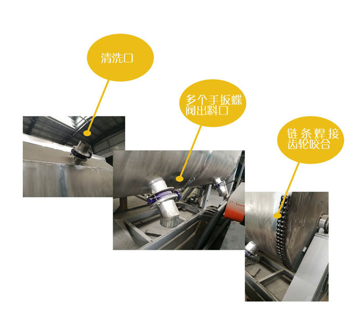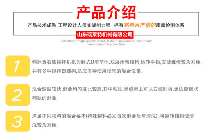 該設(shè)備為臥式U型結(jié)構(gòu),筒體采用碳鋼和不銹鋼(201/301) 材質(zhì),內(nèi)外兩層螺帶交鍇布置,混合逮度快,均勻度高;軸承及攪拌葉片采用碳鋼/不銹鋼錳鋼鑄造材料,槳葉拋光,結(jié)實好用;設(shè)備的90度翻轉(zhuǎn)結(jié)構(gòu),操作時可將殘余物料卸出,清洗工作更方便,降低了勞動強度,提升了生產(chǎn)效率:各部位密封技術(shù)好,放料口采用防水蝶閥密封,減少了生產(chǎn)過程中的漏料滴水問題。整套生產(chǎn)線由真石漆攪拌機、控制柜、螺旋提升機(20噸以上設(shè)備建議采用斗式提升機)組成,可根據(jù)客戶需要,配置合理機型,批次產(chǎn)量最多可達到40T。